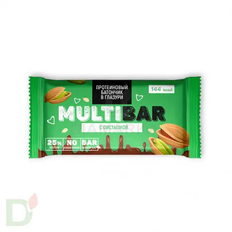 <h2>Высокопротеиновые батончики Мультибар без сахара</h2> Мультибар - продукты для правильного и здорового питания из натуральных ингредиентов. БЕЗ сахара, красителей и ГМО. За сладость в протеиновых батонах Мультибар отвечает изомальтоолигосахарид - природный посдластитель, который обладает сладким вкусом, при этом содержит в разы меньше калорий и углеводов, чем сахар.<br> <br> <h3>Преимущества протеиновых батончиков Мультибар</h3> <ul> <li>пониженное содержание углеводов и калорий</li> <li> не вредят зубам</li> <li> очень сытные и питательные, тк на 20% состоят из белка</li> <li> удобно брать с собой</li> </ul> Мультибар - нежный протеиновый батончик, покрытый шоколадной глазурью. Вкусно, сытно и по калориям приятно. Удобно брать с собой, куда бы вы не направлялись!<br> <br> Масса нетто 40 грамм<br> <h3>Состав батончика Мультибар с Фисташкой</h3> Кондитерская глазурь (подсластитель изомальтоолигосахарид, заменитель какао-масла, какао-порошок, эмульгатор-лецитин соевый Е322, ароматизатор), кокосовое масло, фисташка, концентрат молочного белка сухой, концентрат сывороточных белков сухой (изолят), подсластитель изомальтоолигосахарид, ароматизатор пищевой, консервант (сорбат калия).<br> При чрезмерном употреблении может оказывать слабительное действие. Для непосредственного употребления в пищу как продукт с высоким содержанием легкоусвояемых молочных белков и пищевых волокон.<br> <h4>Пищевая и энергетическая ценность на 1 батончик</h4> Белки 10<br> Жиры 6,6<br> Углеводы 3,5<br> Пищевые волокна 17,1<br> Эн.ценность 146 кКал.
