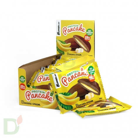 <h2>ПП-сладости для тех, кто на ЗОЖе. 25% белка</h2> Ароматные, нежные, манящие панкейки без сахара и с минимальным содержанием муки. Основа панкейков Бомббар - изолят сывороточного белка (протеин) и пищевые волокна. Такие панкейки и жажду сладенького утолят, и голод победят, и ЖКТ оздоровят!<br> <br> Что самое приятное, этот десерт практически не представляет опасности для уровня сахара крови, так как содержит рекордно малое количество углеводов. Однако будьте внимательны: люди с высокой чувствительностью к углеводам могут заметить более выраженный прирост сахара после панкейков!<br> <br> <b>Протеиновые панкейки Бомббар хороши в качестве десерта для людей с диабетом, тех кто на диете, спортсменов и адептов правильного питания.</b><br> <br> Вес панкейка - 40 грамм<br> Срок годности - 12 месяцев<br> <h2>Состав панкейка Банановый Крем</h2> изолят сывороточного белка, продукты яичные (меланж яичный), изомальтоолигосахарид, начинка со вкусом бананового крема (олигофруктоза (пищевые волокна из цикория), вода, изолят молочного белка, сыворотка сухая деминерализованная, масло кокосовое, банан, агент влагоудерживающий (глицерин), загуститель (ксантановая камедь), ароматизаторы натуральные, антиокислитель (аскорбиновая кислота), соль, подсластитель (сукралоза), консервант (сорбат калия)), вода, эритрит (подсластитель), растительное масло, пшеничная цельнозерновая мука (содержит глютен), какао-порошок, агенты влагоудерживающие (глицерин, сорбит), регуляторы кислотности (лимонная кислота, гидрокарбонат натрия (сода пищевая)), сыворотка сухая деминерализованная, соль, ароматизаторы натуральные, антиокислитель (аскорбиновая кислота), подсластитель (сукралоза), консервант (сорбат калия).<br> <br> Содержит эритрит, сорбит. При чрезмерном употреблении может оказывать слабительное действие. *содержит глютен<br> <h2>Пищевая и энергетическая ценность на 1 шт</h2> б 10<br> ж 5,3<br> у 2,7<br> клетчатка 5,9<br> ккал 110